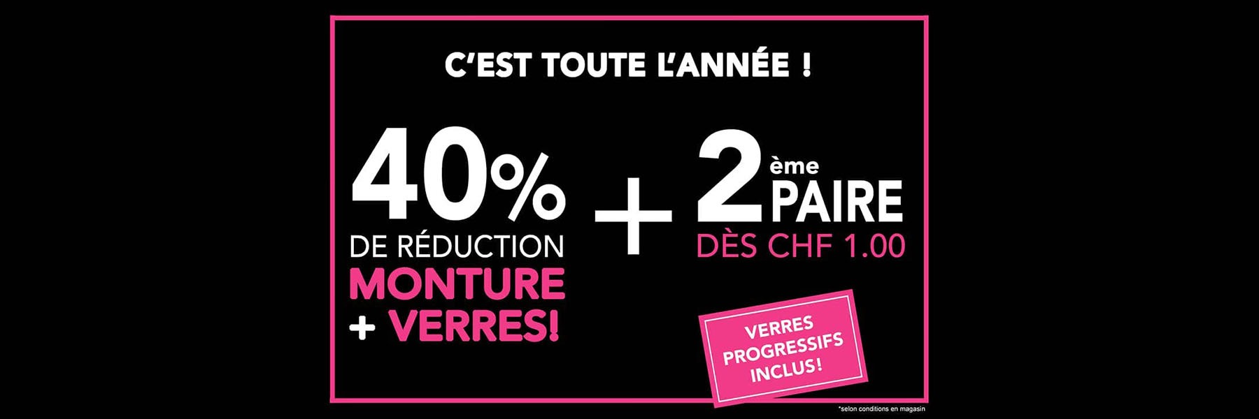Optique du Mont-Blanc vous offre TOUTE L’ANNÉE 40% de réduction sur vos montures et sur vos verres, même progressifs, + une 2ème paire dès CHF 1.00 (monture + verres). Dans le cadre de l’offre de 2ème paire, vous pouvez choisir jusqu’à quatre paires supplémentaires !